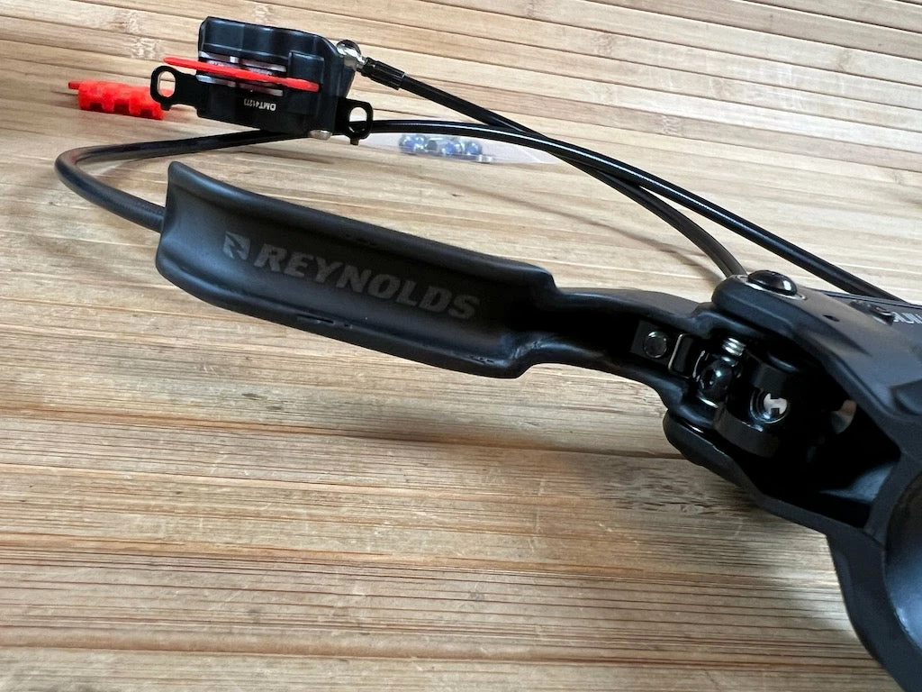 - Bremshebel: Reynolds Carbon, sehr leichtgängig dank gedichteter Kugellager, Flip-Flop-Design